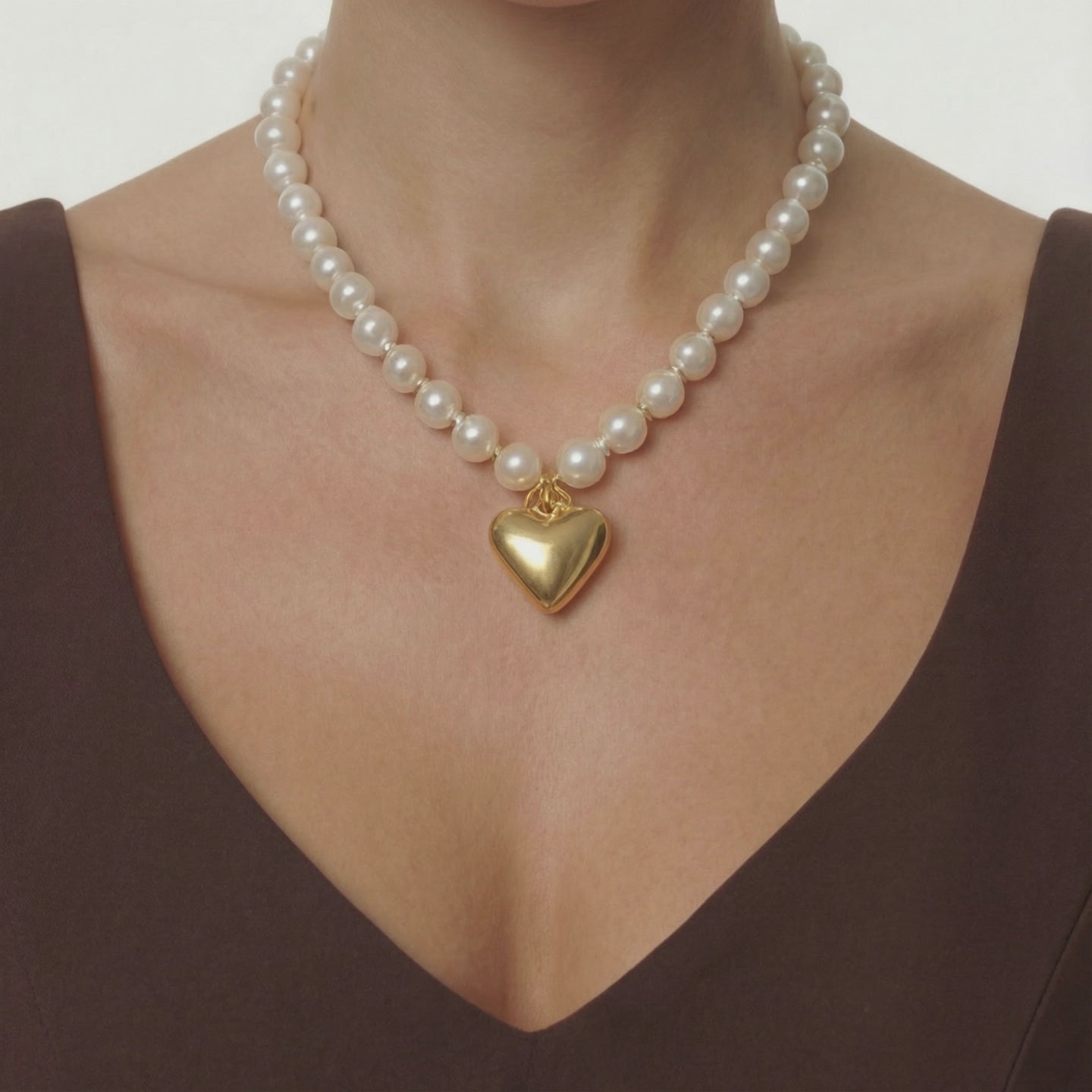 There’s a quiet power in the SOLIS Pearl Necklace — where soft luminosity meets a bold gold heart. Inspired by sun-soaked elegance and timeless forms, this necklace blends modern minimalism with vintage romance. Each pearl is perfectly round and carefully spaced with golden accents, leading to a sculptural gold-tone heart pendant that anchors the piece with warmth and grace.